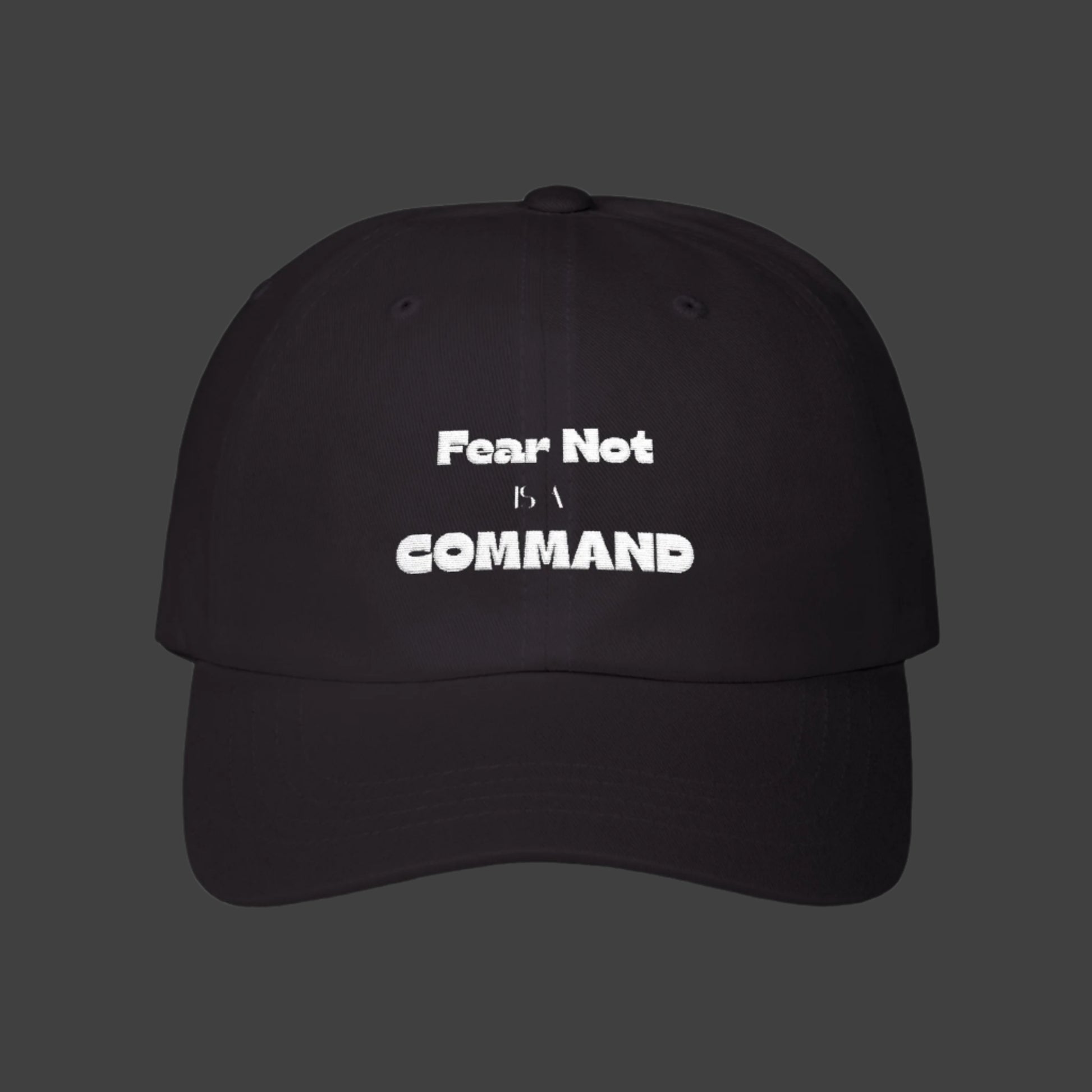 The embroidered classic black "Fear not is a command" baseball cap that offers comfort and style for everyday wear. Perfect for adults looking to add a touch of attitude to their outfit. Ideal for those who enjoy religious and inspirational accessories. Suitable for casual wear, outdoor activities, and as a gift for Christian holidays and occasions.