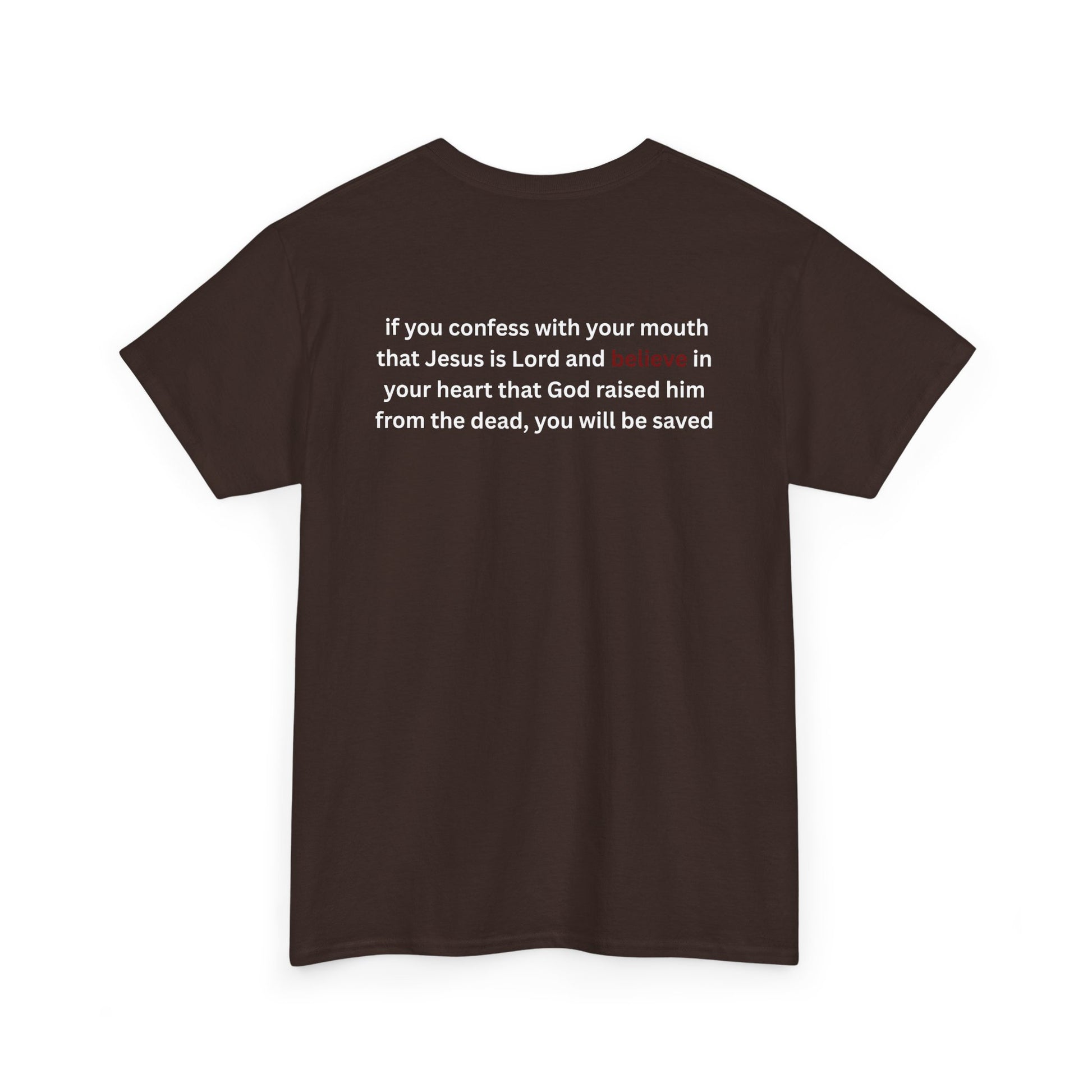 “I BELIEVE” Faith Declaration T-Shirt – Inspired by Romans 10:9 Unisex Heavy Cotton Tee (White Print)